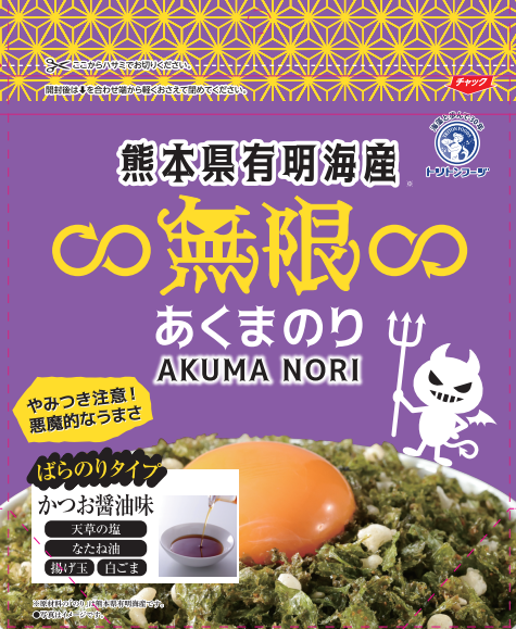 新商品「無限あくまのり」は、かつお醤油味の味付海苔で、揚げ玉のサクサク食感がアクセントになっています。